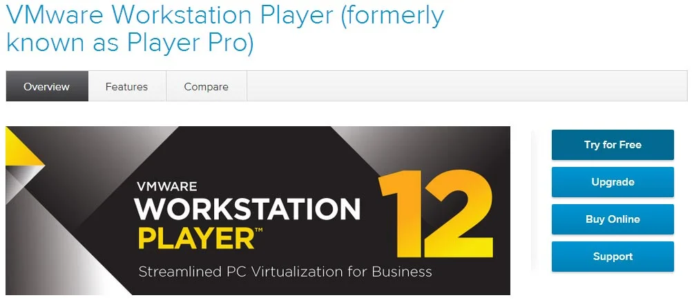 Once you have the ISO file saved you may then download and install the VMware Workstation Player. Use the Try for Free option from the download page.