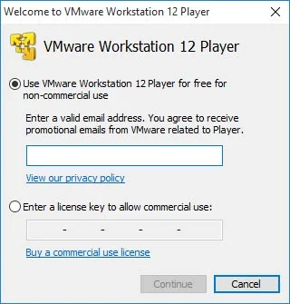 Installation of the VMware Workstation Player client is relatively simple. As you'll be installing the tool for personal use just choose the free for non-commercial use option, enter your email address and click Continue.