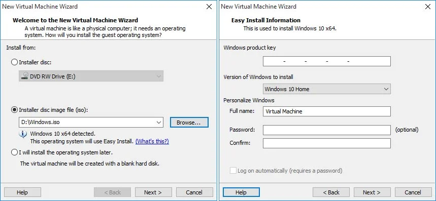 Then you'll select to install using a disc image and select the ISO file from your hard drive and click Next. You can then add a Windows product key if you wish to. If you don't the installation will still proceed but the installation of Windows of course won't activate. Since it's a virtual installation which you might just delete after a while it doesn't matter so much. If you wish you can continue with the installation using a generic key for your ISO image of Windows 8 or 10 which you can find here and enter in the Windows product key field shown below. With a generic key added Windows won't activate either so it's up to you whether you wish to add a key or not. At this stage you can also specify a user account name for the Windows installation as well. Then click Next.