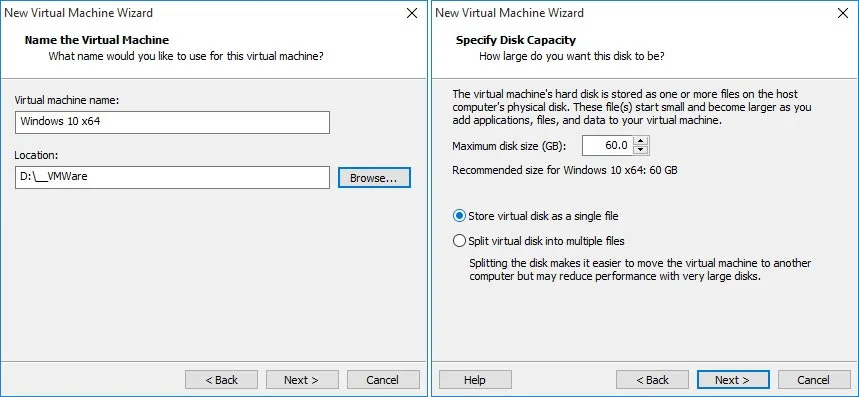 You'll then need to give your virtual machine a name, or keep the default and choose where to save it. The next part of the process requires you to select a disk size for the virtual machine. The recommended default of 60 GB is fine as it refers to the maximum amount of disk space the installation is permitted to use, not the disk space it will actually use. It should utilise no more than 20 GB. Then click Next again.