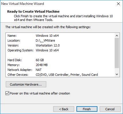 You can also leave the default option of powering on the virtual machine after creation enabled as well so that once the installation has completed the virtual machine will start.