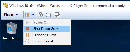 The virtual machine can be shut down, suspended or restarted at any time using the VMware Workstation Player controls available on the upper left of the window. You can also set the virtual machine to run in a full screen borderless window. Note that as you resize the window the resolution of the virtual desktop changes accordingly. You can also set the resolution yourself from inside the virtual machine using the regular Windows desktop resolution controls. Should you wish to shut down the virtual machine and boot it up later you can do so by simply running the VMware Workstation 12 Player a shortcut for which should be on your desktop and then select the virtual machine you wish to run and select the Play virtual machine option.