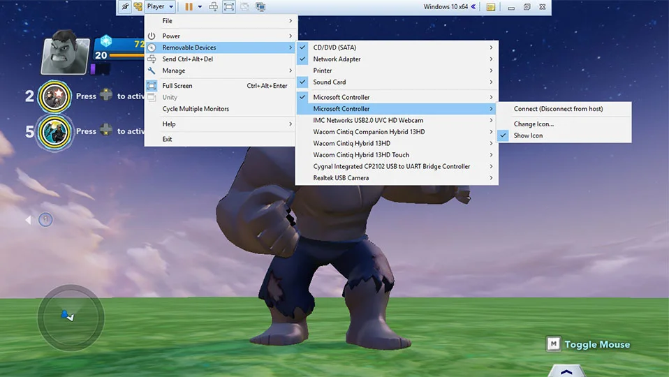 Once the game is hopefully up and running on both the host and virtual PCs if you happen to have a couple of game controllers available to use you can connect both to the host PC and similar to how you connected the external data device. Connect one of the controllers to the virtual machine again using the Player > Removable Devices menu like shown in the example screen below.